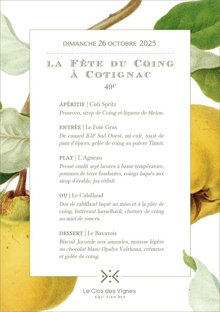 Dans le cadre des Dimanches d’Automne du Clos nous vous proposons pour le Dimanche 26 octobre, Fête du Coing à Cotignac un menu spécial … coing !!!