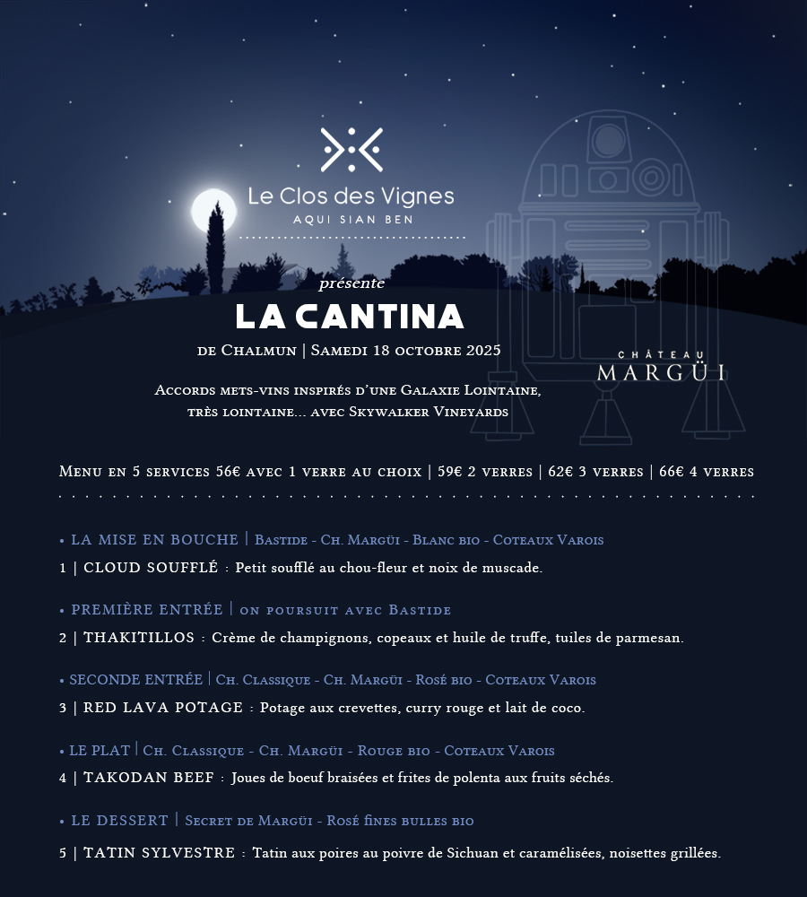 Et quoi de plus pertinent que de vous proposer des accords autour des vins du Château Margüi Skywalker Vineyards !