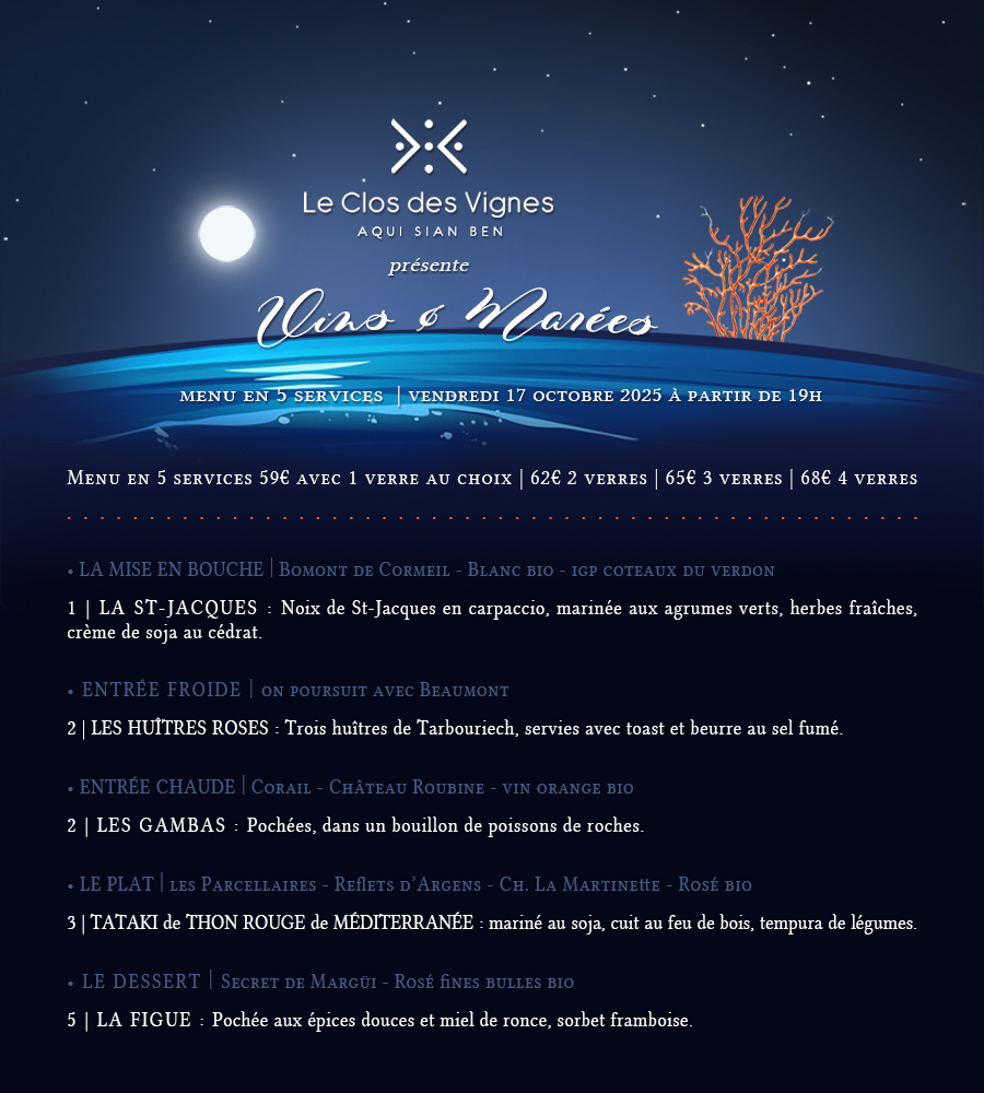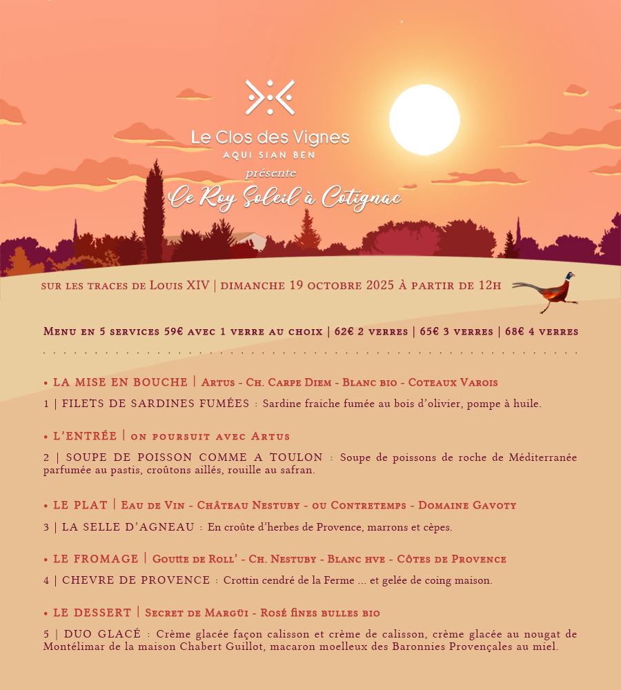 Ces mets seront sublimés par les vins du Château Nestuby, Source du Roy, dont les vignes abritent et entourent notre établissement, et les vins du Château Carpe Diem, au-delà de la Colle d’Auban !