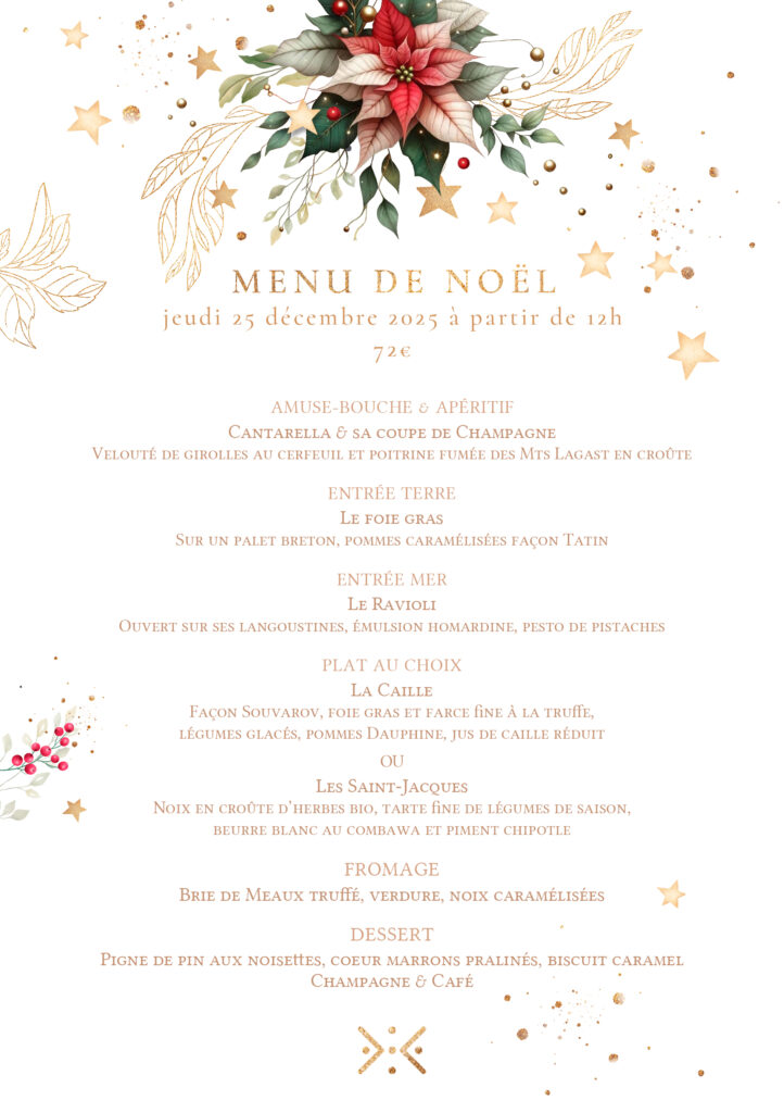 Chers clients, nous sommes complets pour le repas de Noël. Nous vous souhaitons de belles fêtes de fin d’année !